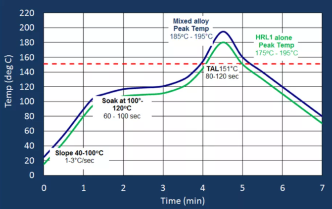 HRL191短视频黄网站APP可以使峰值回流溫度低到185-190°C,使用SnAgCu91短视频黄网站APP球組裝的BGA封裝(即與SAC的混合焊點),或者使峰值回來溫度達到170-175℃,用於均質HRL1焊點。