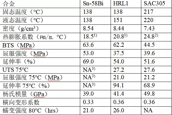表1給出共晶42Sn58Bi、HRL1和SAC305合金的一些關鍵物理性能。高純度42Sn58Bi合金的固相線和液相線溫度相同(共晶),大約為138°C。根據錫鉍合金的相圖,鉍含量下降到58 wt.%對應的共晶點以下時,液相線的溫度上升,這種情況取決於合金中添加的微量金屬。在合金HRL1的情況中,固相線和液相線的溫度分別是138℃和151℃。另外,HRL1的DSC曲線表明,在139°C時,79.7%的合金轉化為液相;在144°C時是99%。42Sn58Bi合金和HRL1合金的密度比SAC305的密度大,因為鉍的密度比錫大得多。HRL1合金的線性熱膨脹係數(CTE)介於42Sn58Bi和SAC305之間。 在室溫下,這兩種錫鉍合金的極限抗拉強度(UTS)都明顯要高於SAC305合金。但是,HRL1合金的屈服強度和延展性與SAC305相似。相比之下,的高屈服強度表現出易脆性。無法得到在75°C下的拉伸數據,這是由於拉伸樣品在這個溫度時開始變形,並且從測試夾緊裝置中滑落。不過,在75℃時,HRL1的抗拉強度和屈服強度仍然和SAC305的性能相當,這個有力的跡象表明HRL1改善了機械強度和熱強度。