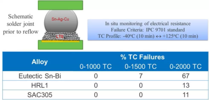 下一代LTS合金值得注意的是,隻降低合金的熔點還不足以解決這類技術在可靠性方麵的困難。例如,共晶42Sn58Bi合金會是一種合乎邏輯的選擇,它的熔點是138°C,但是,它的延展性比較低,熱疲勞壽命比較差,不如現在正在使用的SAC305合金。
