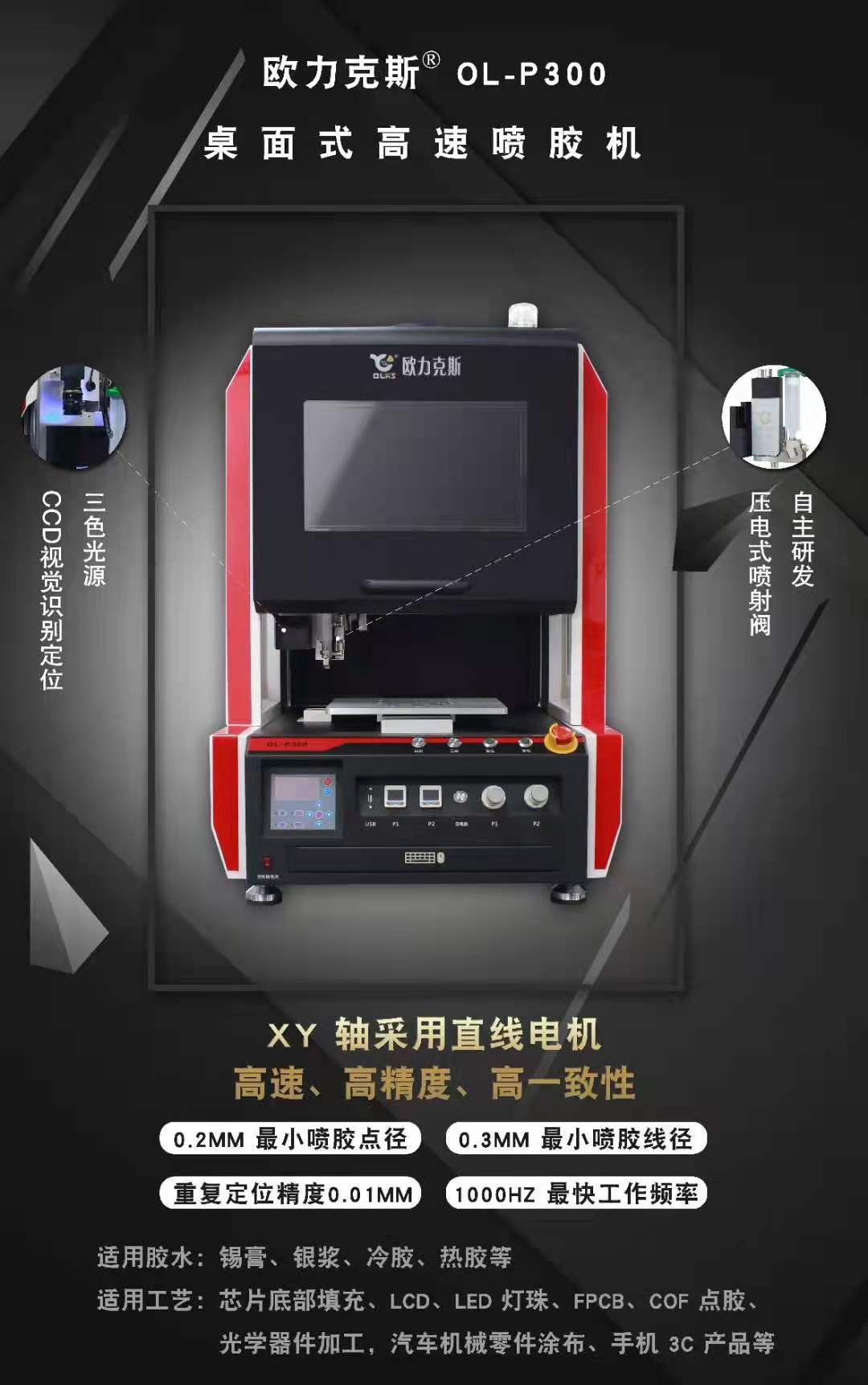 全自動智能視覺91短视频推广機采用window中文操作係統,智能化軟件,操作簡單,易懂,全區視覺對位係統及高精度視覺定位係統自動識別,可以對產品進行打點、走直線、畫圓弧、不規則曲線功能。可點 劃,封任意圖形軌跡。采用非接觸式的高精度噴射91短视频推广係統可在微小間隙進行微小膠量的精密91短视频推广;可選配高精度激光自動測高係統,可精確識別產品高度變化,以確保91短视频推广高度的一致性;可自動識別不良品或不需要91短视频推广的產品,節約生產成本。